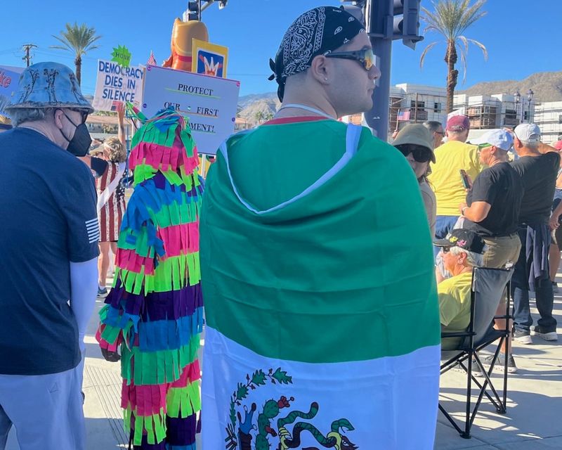 Draped in a Mexican flag, a man named Isaac, of Cathedral City, joined demonstrators at the “No Kings” rally there to stand for democracy, unity, and his community.