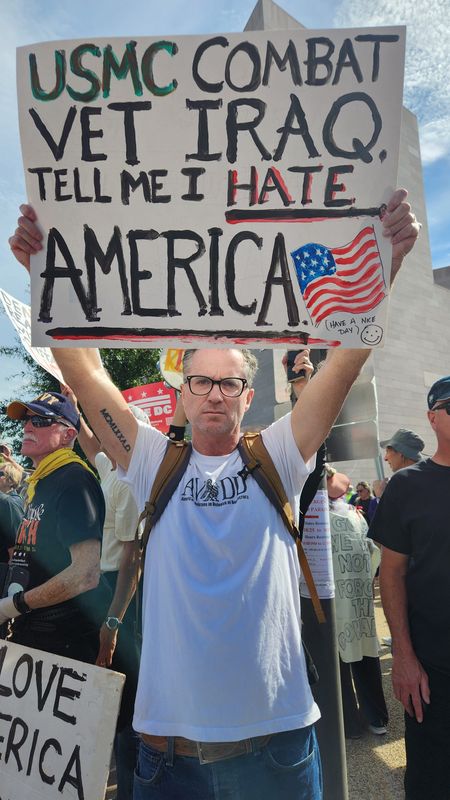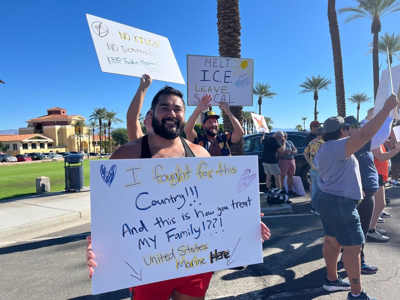 Avarice Guerrero, a Marine Corps veteran, said he came out to the "No Kings" rally in Cathedral City, California to take a stand against what he called growing fear and division under President Donald Trump's leadership.