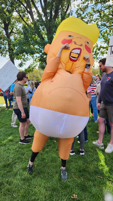Many other protesters in Des Moines were wearing inflatable costumes. Local shops, including The Theatrical Shop, were selling out of the inflatable.