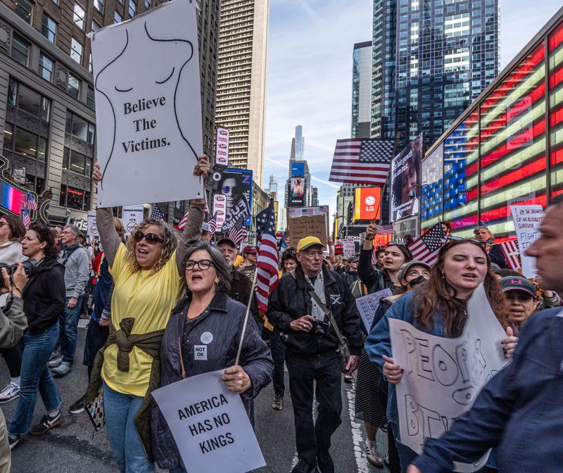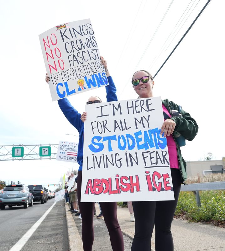 Thousands of New Jerseyans demonstrated in towns across the state. In Jersey City, Grace Smith held a homemade sign that read: "No Kings Since 1776."