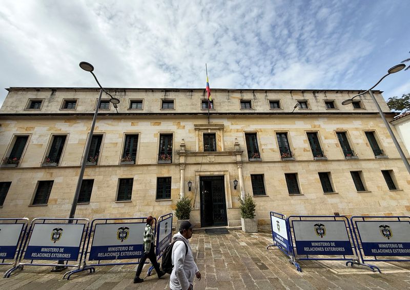 People walk outside of the Colombian Foreign Ministry building, in Bogota, Colombia, October 17, 2025. REUTERS/Luisa Gonzalez