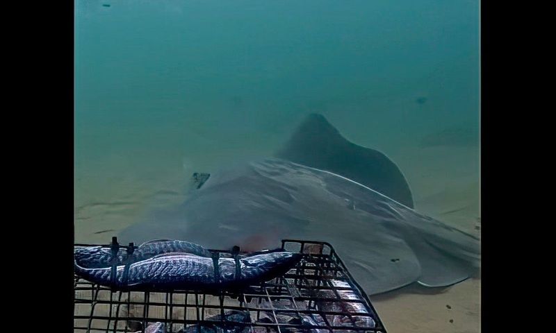The footage, captured off Rhode Island, shows the roughtail stingray – a species that can measure 7 feet across and weigh 600-plus pounds – investigating bait secured inside and on top of the system.