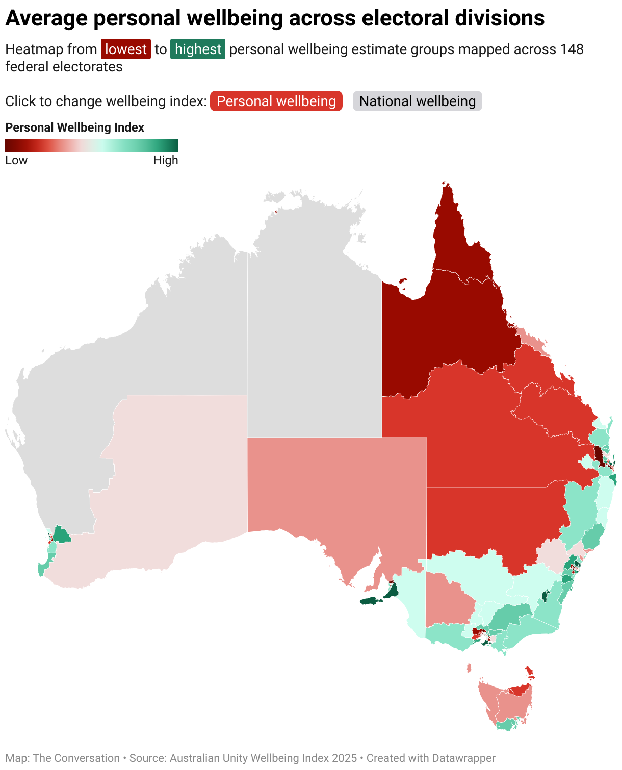 We didn’t estimate wellbeing for Lingiari (Northern Territory) or Durack (Western Australia). This was because these electorates have the highest proportion of First Nations people in the country and our measurement approach may not be relevant or appropriate to Indigenous ways of knowing, being and doing.