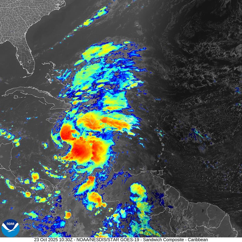 The National Hurricane Center said in an 2 p.m. ET advisory on Oct. 23 that Melissa is located about 200 miles south-southeast of Kingston, Jamaica, with maximum sustained winds near 45 mph with higher gusts.
