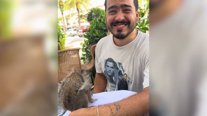 A fearless squirrel staged a brazen food heist on a man dining at a Miami restaurant.