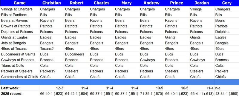 Joining me for 2025 is a seven-person panel ranging from FTW editors (Charles Curtis, Mary Clarke) to betting analysts (Prince Grimes, Jordan Tomiyama) to NFL writers (Robert Zeglinski, Cory Woodroof, who is on vacation this week, and Joseph). Here are our Week 8 picks.