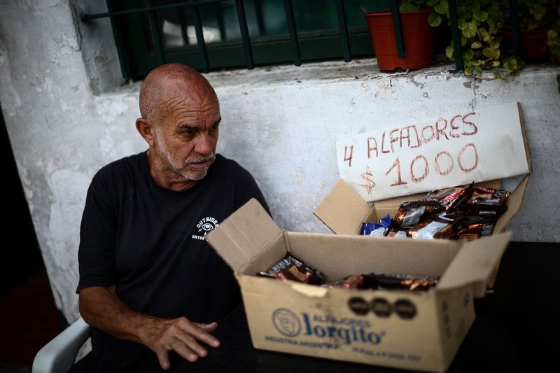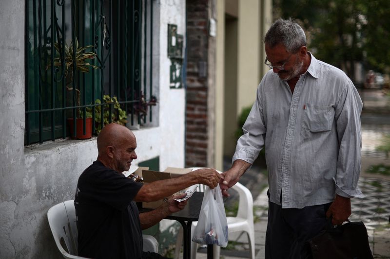 Luis Relinque, 75, sells store-bought alfajores to a customer to make ends meet, as his pension is not enough, outside his home in Buenos Aires, Argentina, February 14, 2025. Relinque receives the minimum monthly pension, which in October was just over 396,000 pesos, or about $266, that he says is not enough to make ends meet. "I don't go hungry, but I go without," he said, sitting alongside his small dog. Treats he used to give his granddaughter, such as an ice cream or a visit to the theatre, he can no longer afford. He used to gather with friends on Fridays to play cards and enjoy a meal, but that has also stopped. REUTERS/Tomas Cuesta SEARCH "CUESTA ARGENTINA PENSIONERS" FOR THIS STORY. SEARCH "WIDER IMAGE" FOR ALL STORIES.