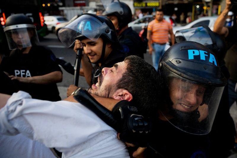 A man is detained during a demonstration against Argentina's President Javier Milei's adjustment policies, in Buenos Aires, Argentina, February 26, 2025. In January, Milei's government announced Argentina's first budget surplus in 14 years. But this has come at a cost. Energy and transportation subsidies have been slashed, while retirees' purchasing power has fallen by 23% since Milei took office, according to economist Enrique Dentice. "Today, the priority of pensioners is covering their groceries and not much else," Dentice said. "It's not clear how that will get better. The government stance is 'wait and see,' but time is passing and pensioners cannot wait." REUTERS/Tomas Cuesta SEARCH "CUESTA ARGENTINA PENSIONERS" FOR THIS STORY. SEARCH "WIDER IMAGE" FOR ALL STORIES.