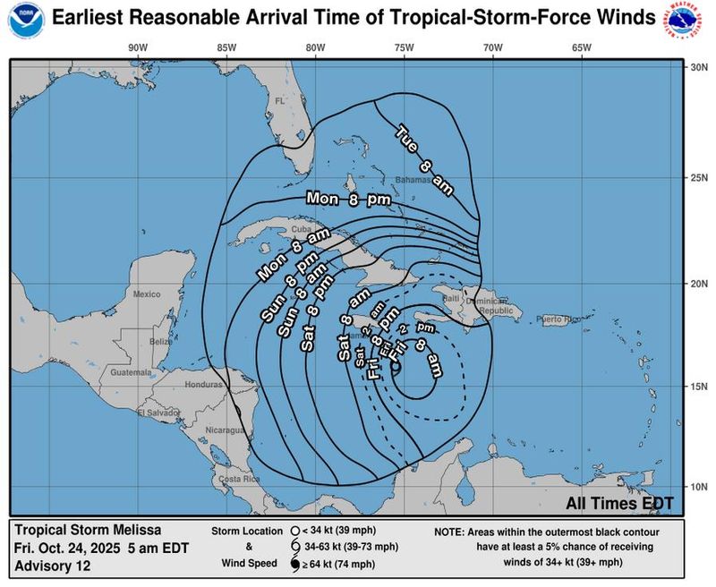 Forecasters said Melissa is drifting east-southeast at 2 mph. It is expected to turn to the northeast and north at a "continued slow motion" in the afternoon or night on Friday, Oct. 24. The storm will then drift westward on Saturday, Oct. 25, and continue through Monday, Oct. 27. By early next week, the storm is expected to move near or just south of Jamaica.