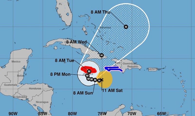 Jamaica, directly in Melissa’s path, is the red portion of the accompanying graphic, courtesy of the Florida-based National Hurricane Center.