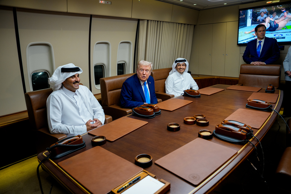 El presidente de Estados Unidos, Donald Trump, tenía un programa de la UFC en la sala de conferencias del Air Force One, mientras se reunía con el emir catarí, Tamim bin Hamad al Thani, y el primer ministro, Mohammed bin Abdulrahman bin Jassim al Thani. La foto fue publicada por el corresponsal de Bloomberg, Josh Wingrove.