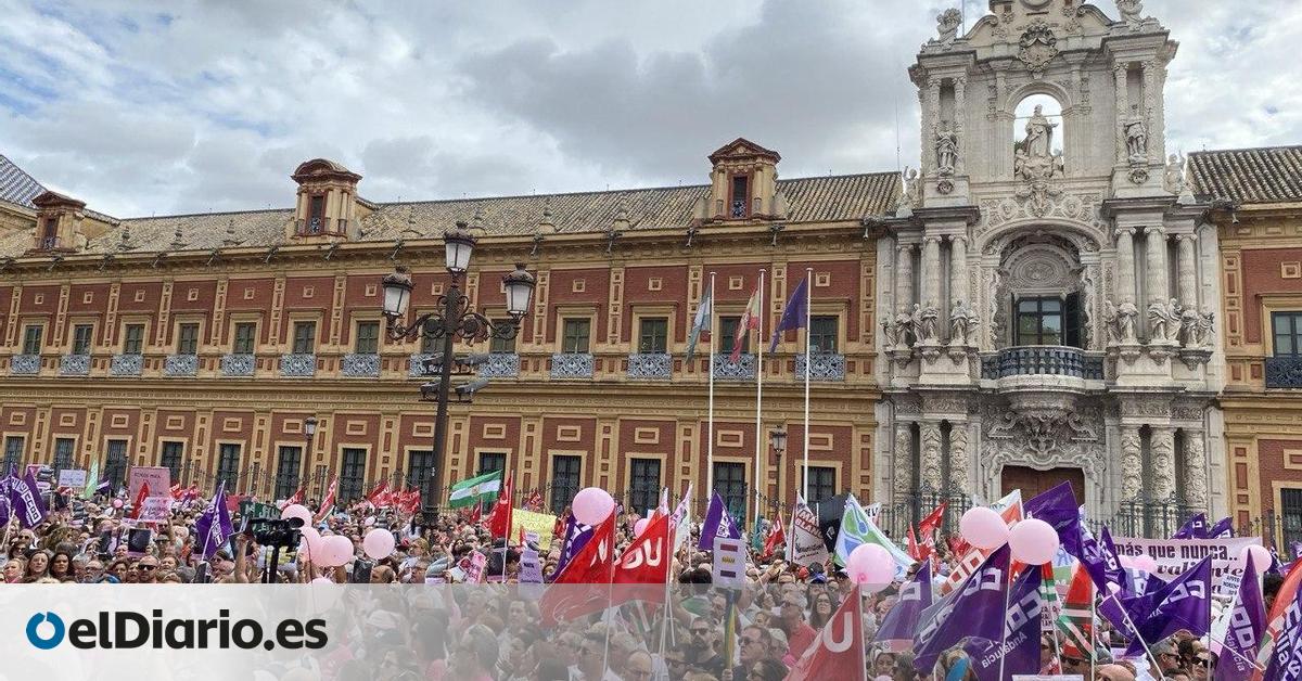Ya lo decía Ángela Claverol, presidenta de la Asociación de Mujeres con Cáncer de Mama de Sevilla , en la víspera: “Os necesitamos para demostrarle a la Junta de Andalucía que no somos 2.000 ni 20.000... somos muchas mujeres en Andalucía”. Y así ha ocurrido, porque pese a que las condiciones climatológicas no han acompañado miles de personas se han plantado ante la misma puerta del Gobierno andaluz, en el Palacio de San Telmo, para cargar contra el Ejecutivo de Juan Manuel Moreno no sólo por esta crisis por los fallos en el cribado de cáncer de mama, sino por el hundimiento general de la sanidad pública andaluza.