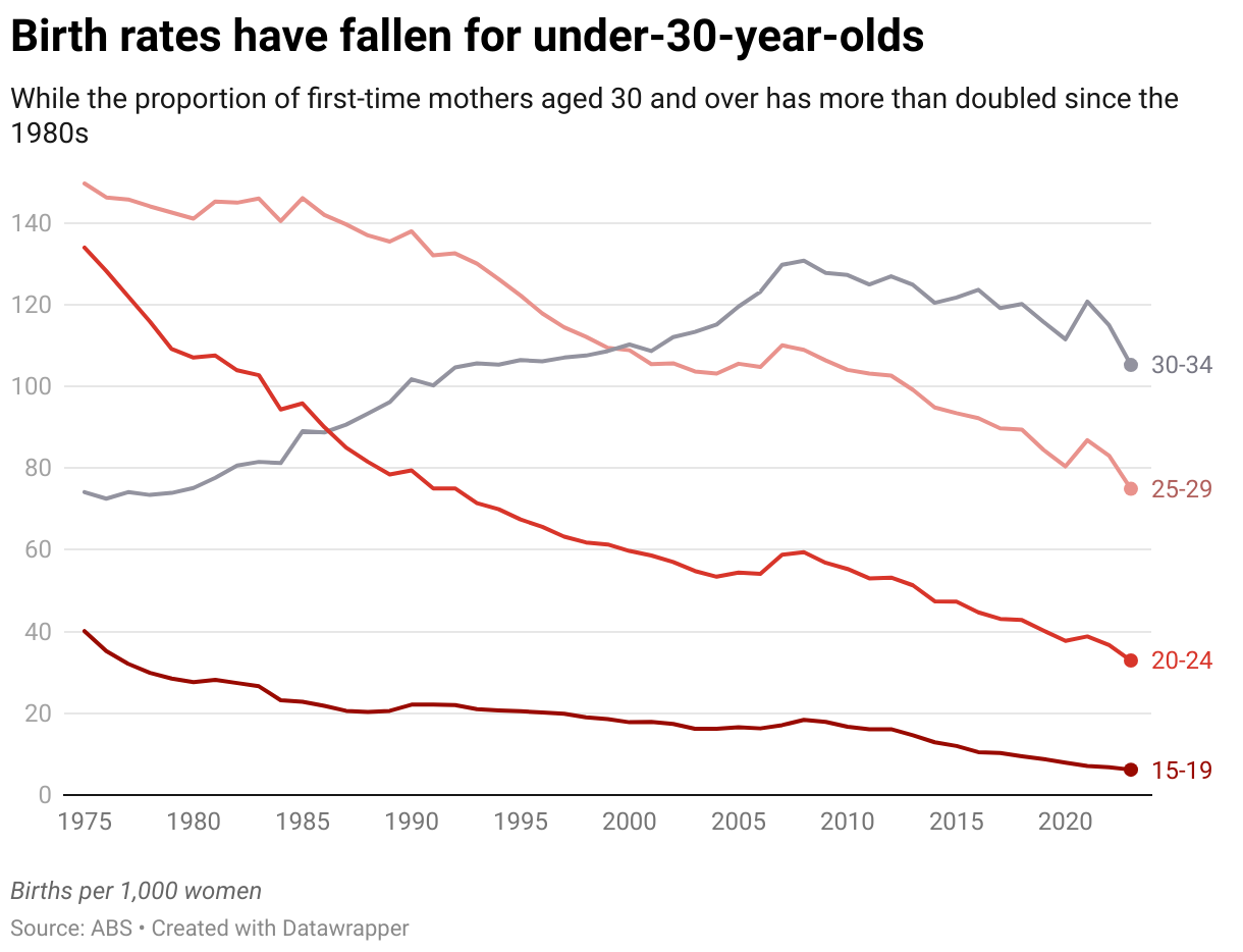 The proportion of first-time mothers aged 30 and over has more than doubled since the 1980s, but the fertility rates of every age group under 35 have declined since the mid-2010s.