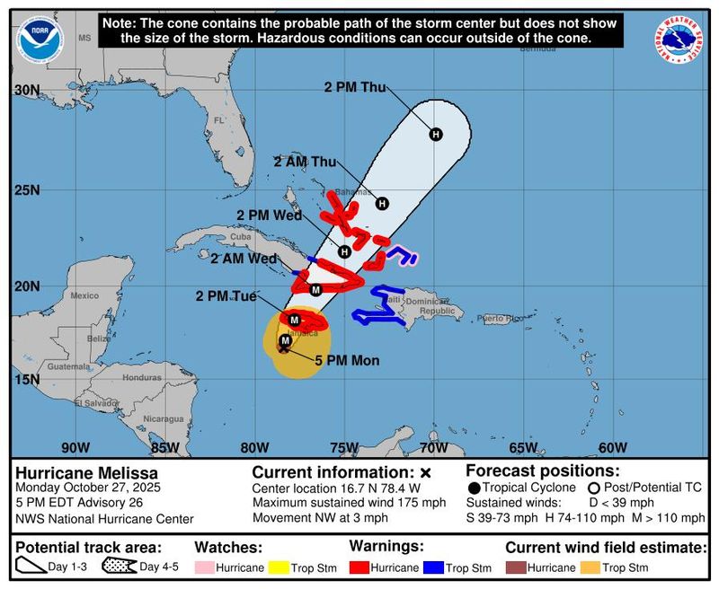 Melissa, a Category 5 storm, is expected to slam into the southern coast of Jamaica on Tuesday morning, Oct. 28, with catastrophic consequences. It's also set to approach Cuba as a major hurricane and cross the central and southeastern Bahamas, forecasters said. Melissa poses no direct threat to the United States.