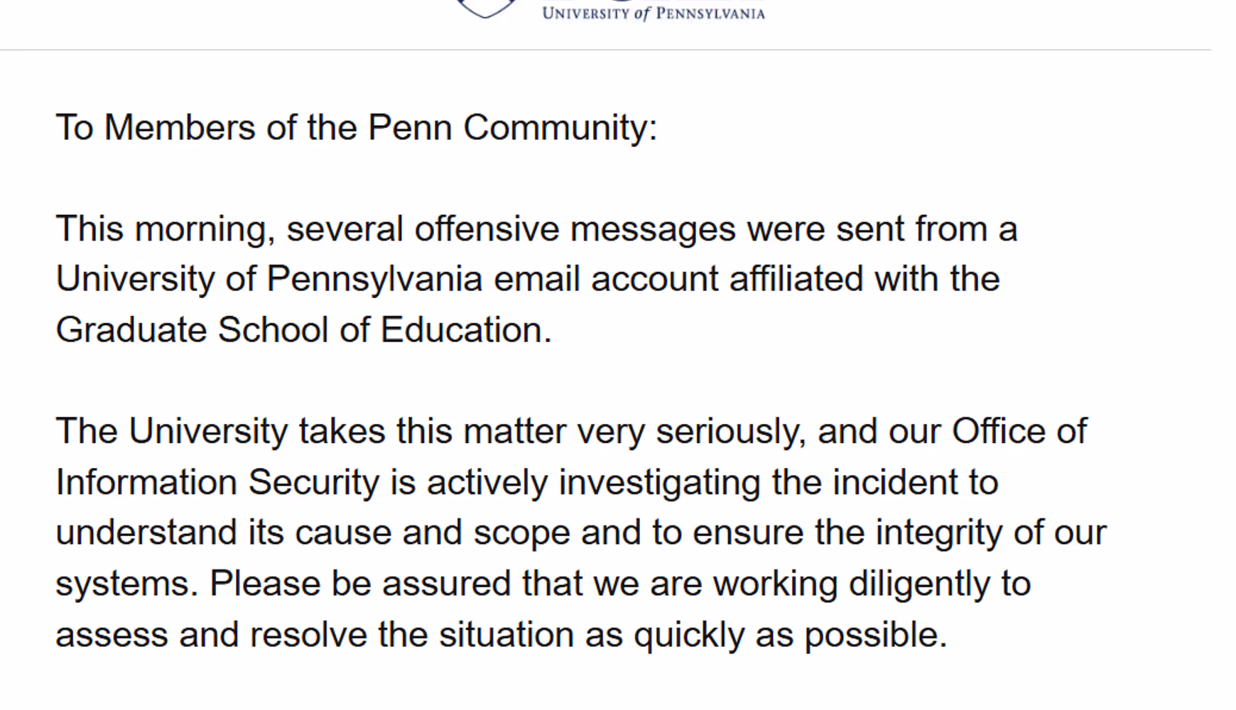 Later that day, the university followed up with an email to community members acknowledging that “several offensive messages were sent from a University of Pennsylvania email account affiliated with the Graduate School of Education.”