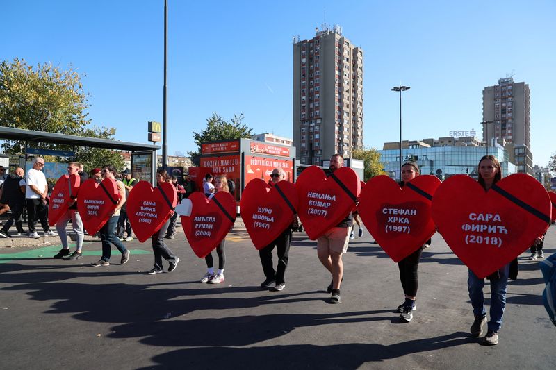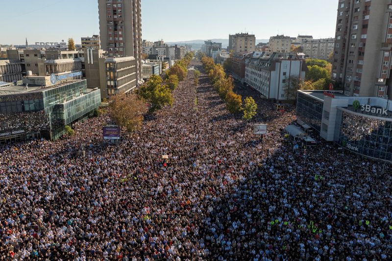 NOVI SAD, Serbia (Reuters) -Tens of thousands of protesters poured into Serbia's second city on Saturday a year after a railway station roof collapse that killed 16 people, unleashing discontent over alleged corruption and a lack of accountability many blame for the disaster.