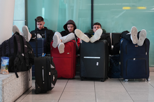 FILE - Travelers sit together and wait at the Baltimore/Washington International Thurgood Marshall Airport in Baltimore, Oct. 2, 2025. (AP Photo/Stephanie Scarbrough, File)