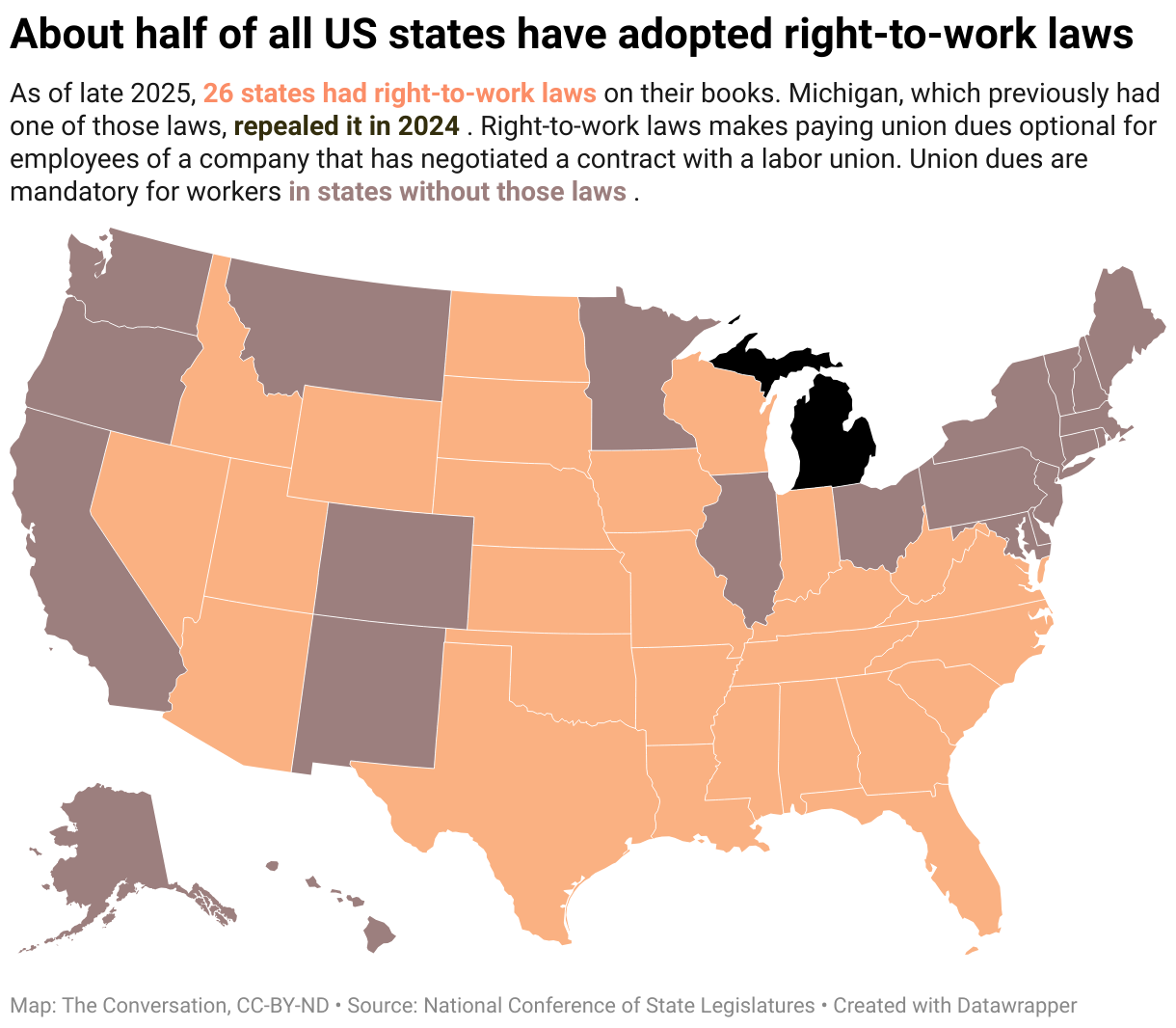 Right-to-work laws let workers skip paying union dues when they’re employed by a company that has negotiated a contract with a labor union. In states without right-to-work laws, those dues are mandatory. As a result, right-to-work laws weaken unions’ ability to negotiate better working conditions and reduce the share of workers who belong to unions.