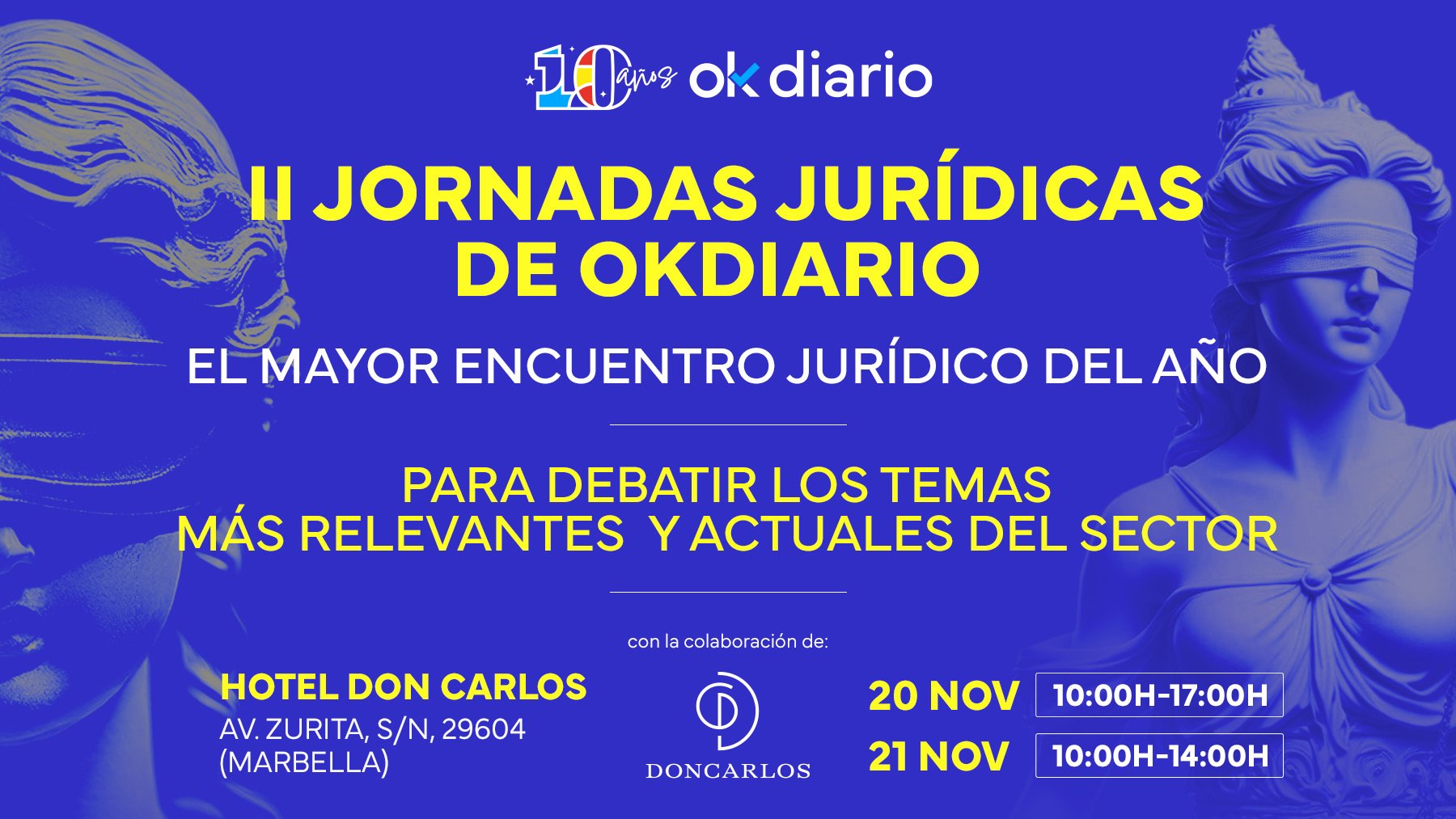 Los días 20 y 21 de noviembre de 2025 , la ciudad malagueña de Marbella se convertirá en el epicentro del debate jurídico español con la celebración de las II Jornadas Jurídicas de OKDIARIO. Magistrados del Tribunal Supremo, fiscales de la Audiencia Nacional, vocales del Consejo General del Poder Judicial (CGPJ), académicos y juristas de toda España se reunirán en el Hotel Don Carlos para analizar el presente y anticipar el futuro del Derecho en un encuentro que promete ser clave.