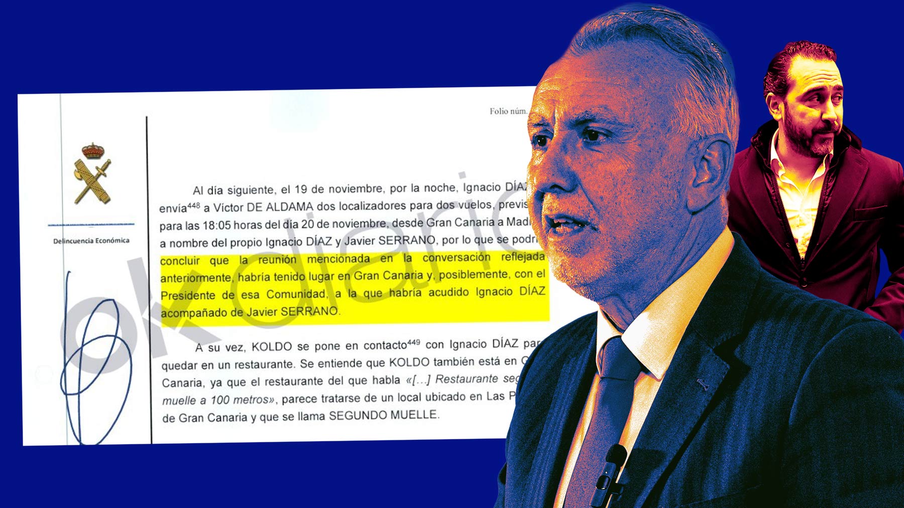 Así, la UCO recoge en su informe que el 19 de noviembre de 2020, por la noche, Ignacio Díaz le envió a Víctor de Aldama « dos localizadores para dos vuelos , previstos para las 18:05 horas del día 20 de noviembre, desde Gran Canaria a Madrid, a nombre del propio Ignacio Díaz Tapia y de Javier Serrano, por lo que se podría concluir que la reunión mencionada en la conversación reflejada anteriormente, habría tenido lugar en Gran Canaria y, posiblemente, con el presidente de esa comunidad, a la que habría acudido Ignacio Díaz acompañado de Javier Serrano», señalan los investigadores.