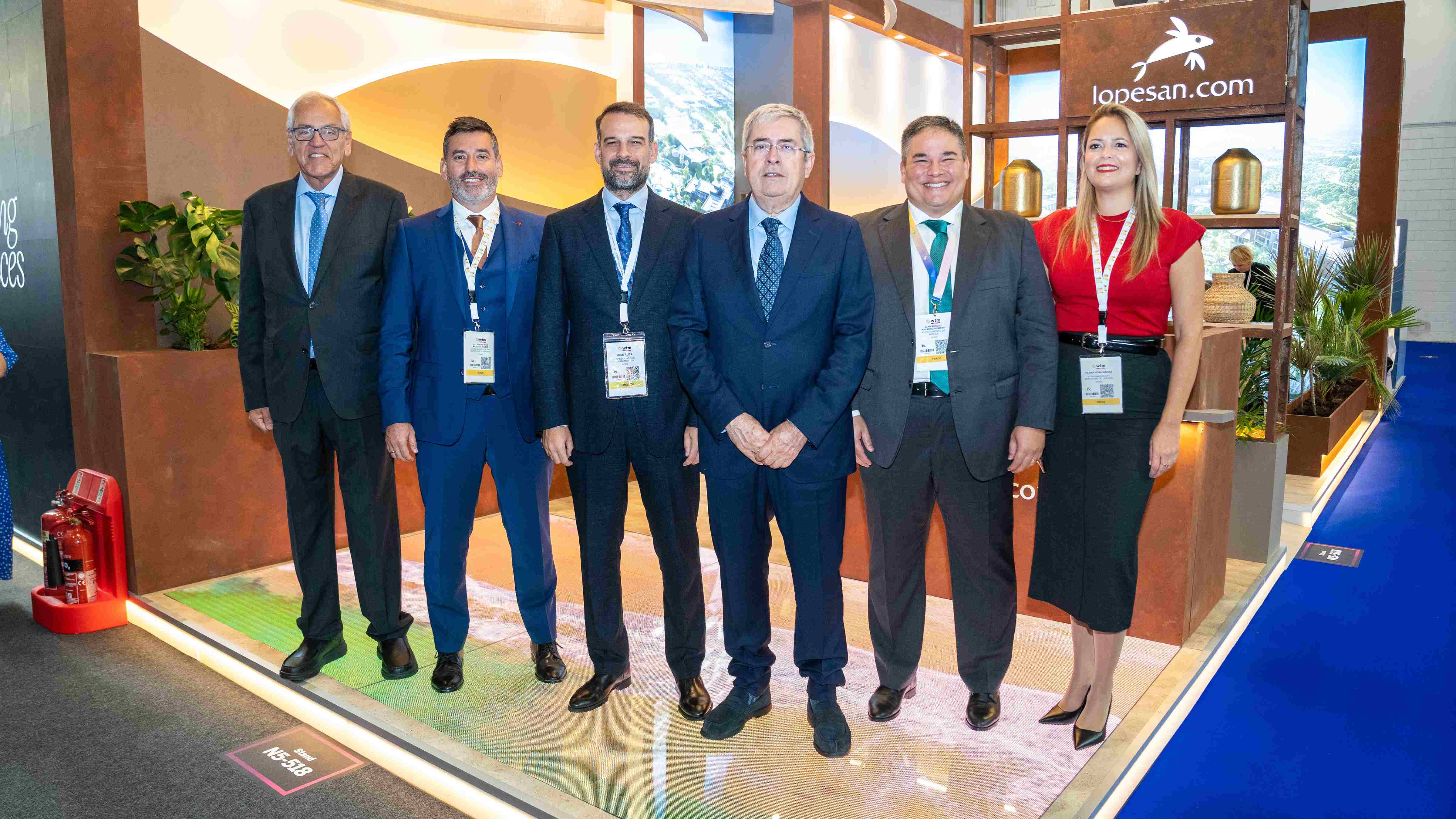 El alcalde de San bartolomé de Tirajana, Marco Aurelio Pérez, junto con el primer teniente de alcalde y concejal de urbanismo, Alejandro Marichal, la concejala de Turismo, Ylenia Vega, el concejal de Deportes, Ramón Suárez, y el concejal de Turismo del Mogán, Mencey Santana, visitaron el original stand de Lopesan Hotel Group en la WTM y analizaron los planes de inversión continua previstos por la compañía, de la mano de su director general, José Alba.