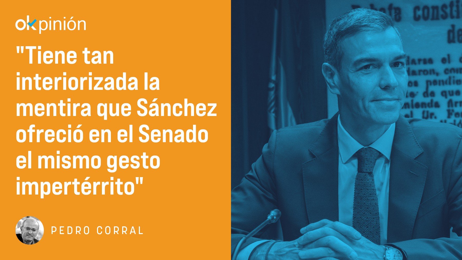 Al principio se le notaba en la cara cuando mentía. Ahora tiene tan interiorizada la mentira, pues vive instalado en ella permanentemente, que Sánchez ofreció en la comisión del Senado el mismo gesto impertérrito de principio a fin. Impasible el ademán, prietas las filas, que para eso están en el Año Franco.