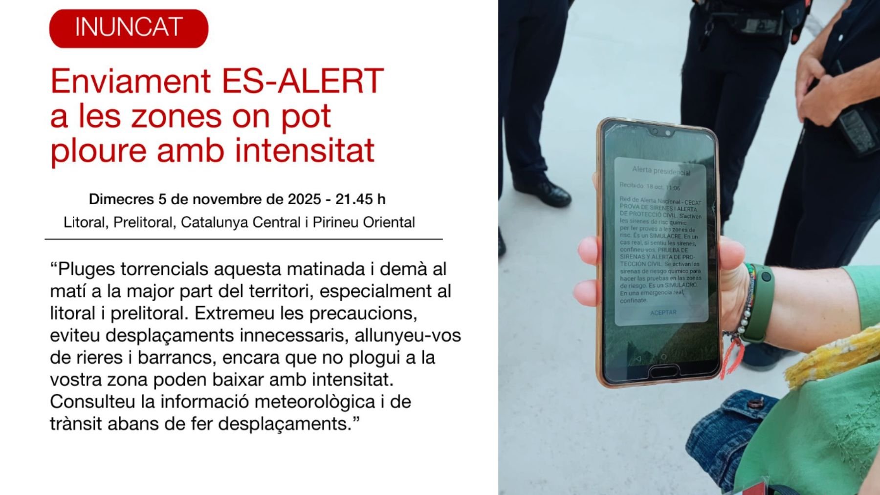 La Generalitat de Cataluña ha enviado una alerta preventiva (EsAlert) a los móviles en las zonas que pueden resultar más afectadas por el episodio de fuerte lluvias que afectará a Cataluña a partir de esta madrugada y que se prolongará casi todo el jueves. En principio, no hay restricciones de movilidad, pero las autoridades han pedido minimizar los desplazamientos y evitar acercarse a ríos y barrancos.