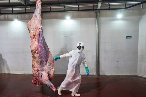 Un trabajador arrastra una pieza de carne en la planta de procesamiento de Frigolar, en La Plata, Argentina, el 6 de noviembre de 2025. (AP Foto/Rodrigo Abd)