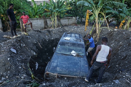 Residentes trabajan para rescatar un auto parcialmente enterrado tras el paso del huracán Melissa por Petit-Goave, Haití, el 6 de noviembre de 2025. (AP Foto/Odelyn Joseph)