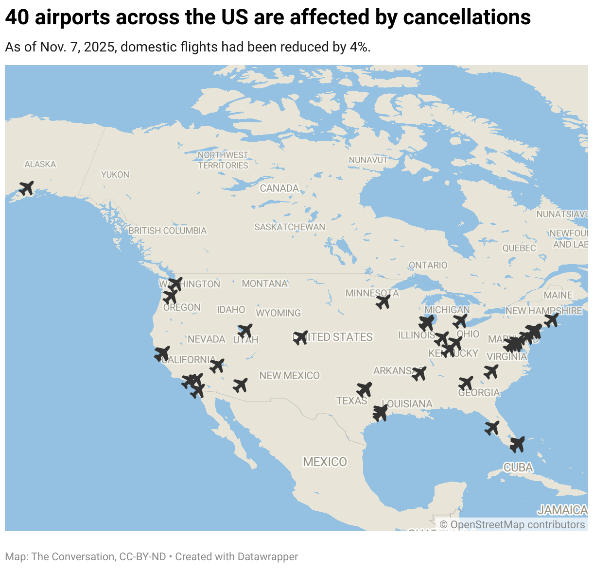 Major airports across the United States were subject to a 4% reduction in flights on Nov. 7, 2025, as the government shutdown began to affect travelers.