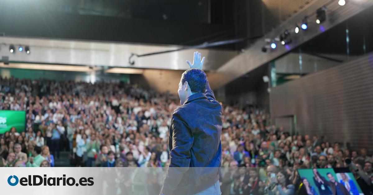 Todo verde. El telón de fondo del XVII Congreso del PP andaluz es un enorme rectángulo verde, con la serigrafía del PP andaluz en blanco. El telón de fondo del cónclave para la reelección de Juanma Moreno como presidente del partido son las elecciones andaluzas en la primavera de 2026. “Siempre Andalucía”, reza el lema. Ni rastro del azul corporativo del PP. Y el objetivo indisimulado es revalidar la mayoría absoluta para no depender de Vox, como le ocurre al PP en la Comunidad Valenciana, en Castilla y León, en Murcia, en Extremadura y, previsiblemente, en España.