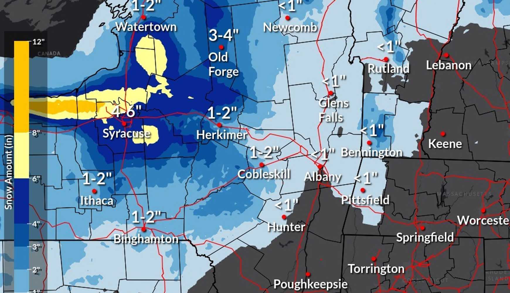 Cities like Syracuse are expected to receive 4 to 6 inches, while areas farther south, including Binghamton, may see 1 to 2 inches. Western Massachusetts, including Pittsfield, is forecast to receive an inch or less of accumulation.