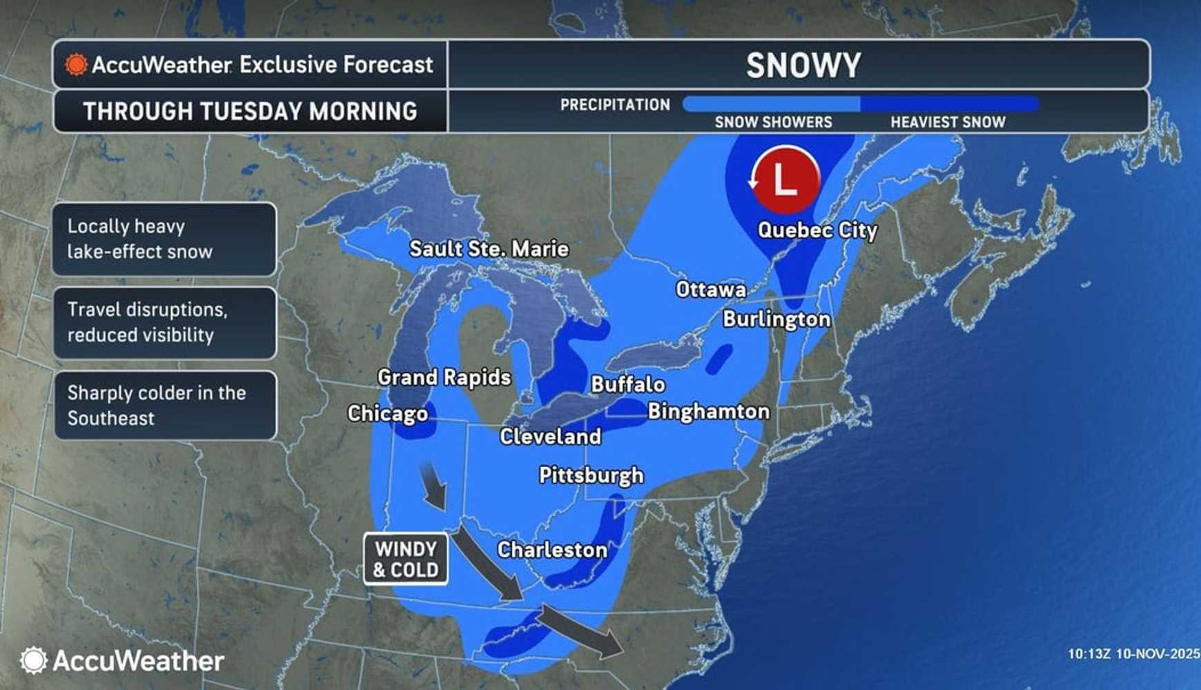 The snow is part of a larger lake-effect event stretching from Illinois to New York, triggered by steady winds blowing across the warm waters of the Great Lakes.