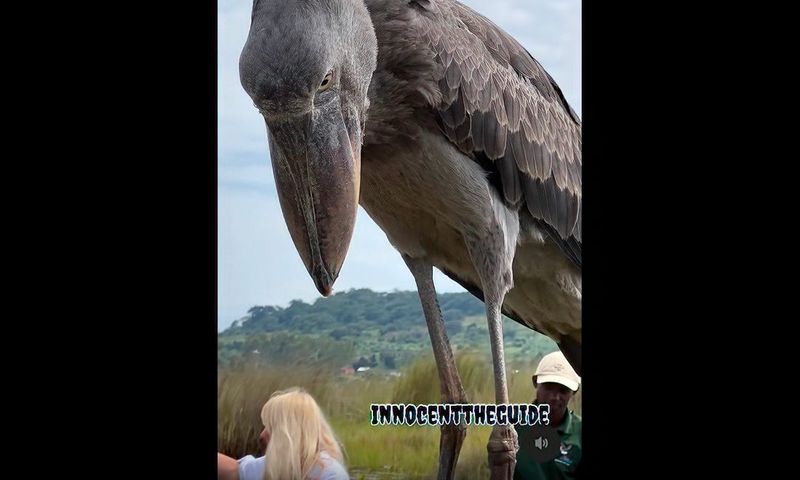 The accompanying footage, showing a shoebill that had just landed on a tour boat in Mabamba Bay, Uganda, provides a captivating perspective that makes the bird appear truly gargantuan. (The tourist in the boat is trying to capture a selfie.)