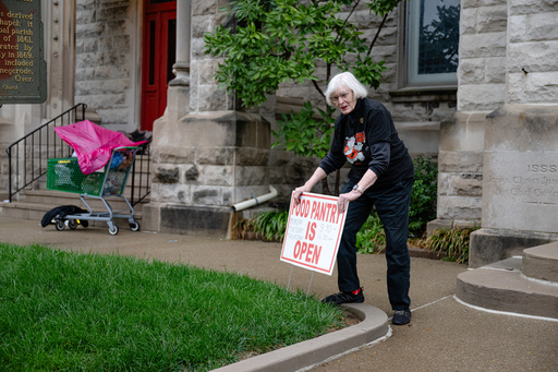 Margaret Dickinson announces the opening of food pantry service with the placement of a sign at Calvary Episcopal Church on Thursday, Oct. 30, 2025, in Louisville, Ky. (AP Photo/Jon Cherry)