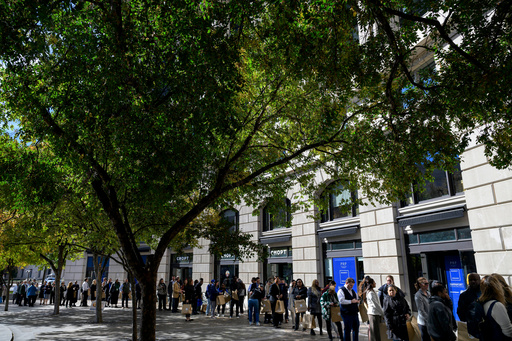 People wait to shop for food at Irving Park Community Food Pantry in Chicago, Wednesday, Nov. 5, 2025. (AP Photo/Nam Y. Huh)