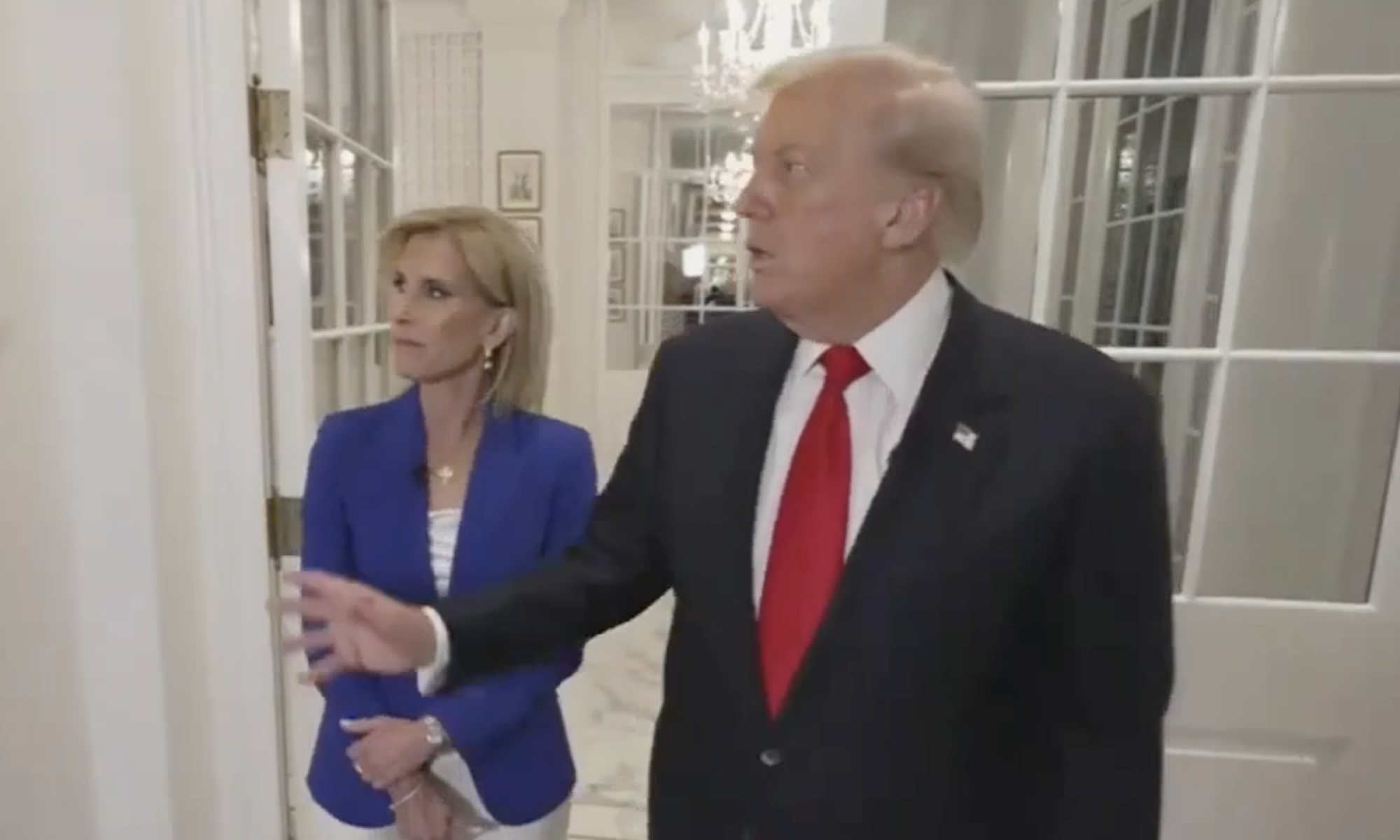 "Take a look at this, fellas, if you want to see detail," Trump told Ingraham's camera crew. "Most people do a sign and paint it on the wall. So that's half inch thick bronze. Carved. By a very talented person. And it's brass. It's pure brass."