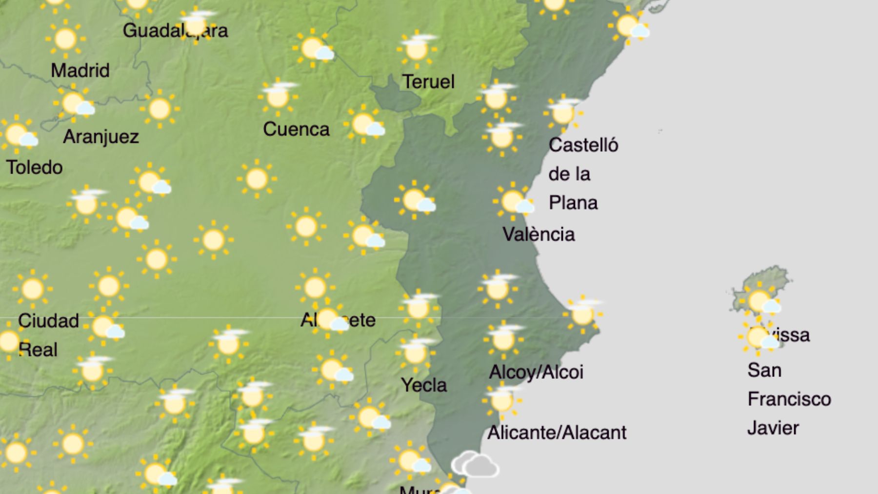 «Cielo poco nuboso con intervalos de nubes altas. Posibles brumas y bancos de niebla en el litoral sur por la mañana. Temperaturas en ligero ascenso, más acusado en el caso de las máximas en el interior. Viento flojo variable, predominando la componente este en las horas centrales y tendiendo a nordeste moderado en el litoral por la tarde», ha dicho la AEMET con respecto al tiempo en la provincia de Alicante .