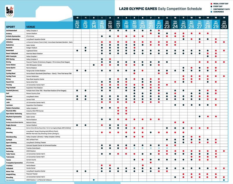The Los Angeles Olympic Games will be the biggest Games in history with 51 sports across 49 competition venues throughout the Los Angeles region and Oklahoma City. The Olympic Opening Ceremony will take place July 14, 2028 at 8 p.m. ET and the Closing Ceremony will be Day 16, July 30, 2028 at 9 p.m. ET. Here is the full list of events by date and time.