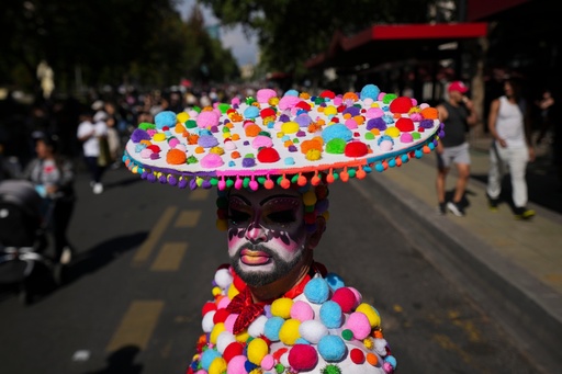 El artista drag "Póstuma" participa en el Desfile del Orgullo anual para celebrar la diversidad en Santiago, Chile, el 8 de noviembre de 2025. (AP Foto/Esteban Félix)