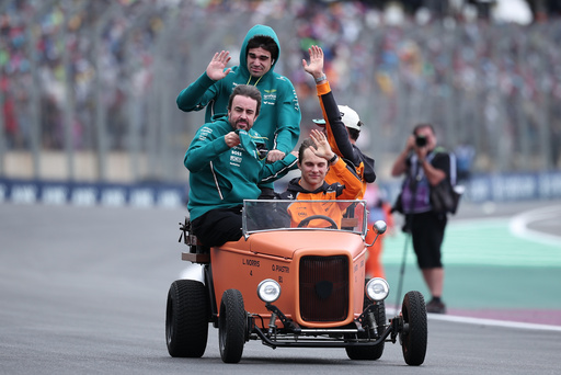 Los pilotos de Aston Martin Lance Stroll (arriba, izquierda) y Fernando Alonso (izquierda), y los de McLaren Oscar Piastri (derecha) y Lando Norris, participan en el desfile de pilotos antes del Gran Premio de Fórmula Uno de Brasil, en el circuito de Interlagos, en Sao Paulo, el 9 de noviembre de 2025. (AP Foto/Ettore Chiereguini)