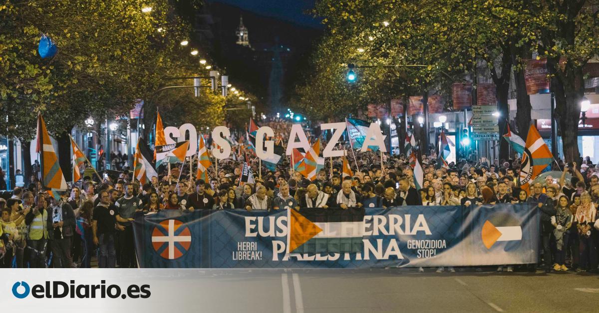 Con bengalas, petardos y gritos de “Israel suntsitu”, “Destruir Israel”, miles de personas han salido a las calles tras una pancarta con la imagen de un futbolista con una metralleta y un pañuelo palestino jugando a fútbol con la cabeza de Isaac Netanyahu como balón, y coreando lemas como 'Israel estatu terrorista (Israel, estado terrorista) y Gora Palestina Erresistentzia (Viva la resistencia palestina), o 'Palestina askatu, Israel suntsitu' (Palestina libre. Destruir a Israel).