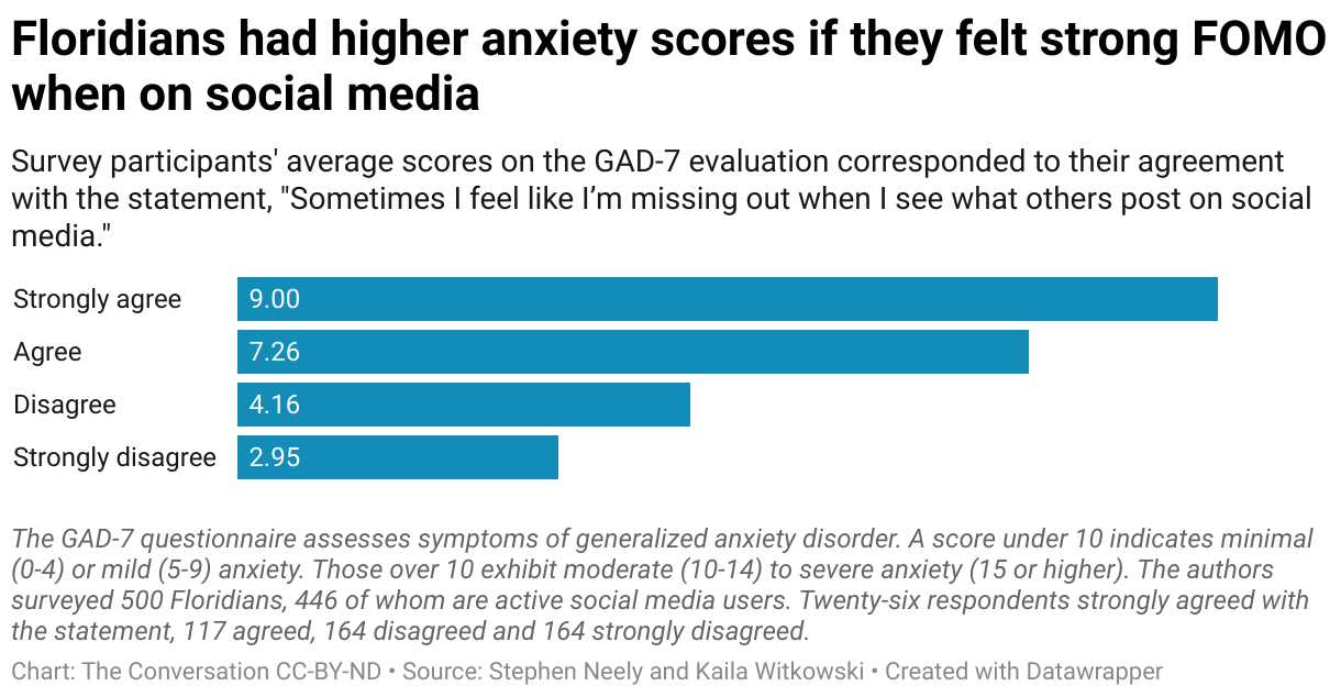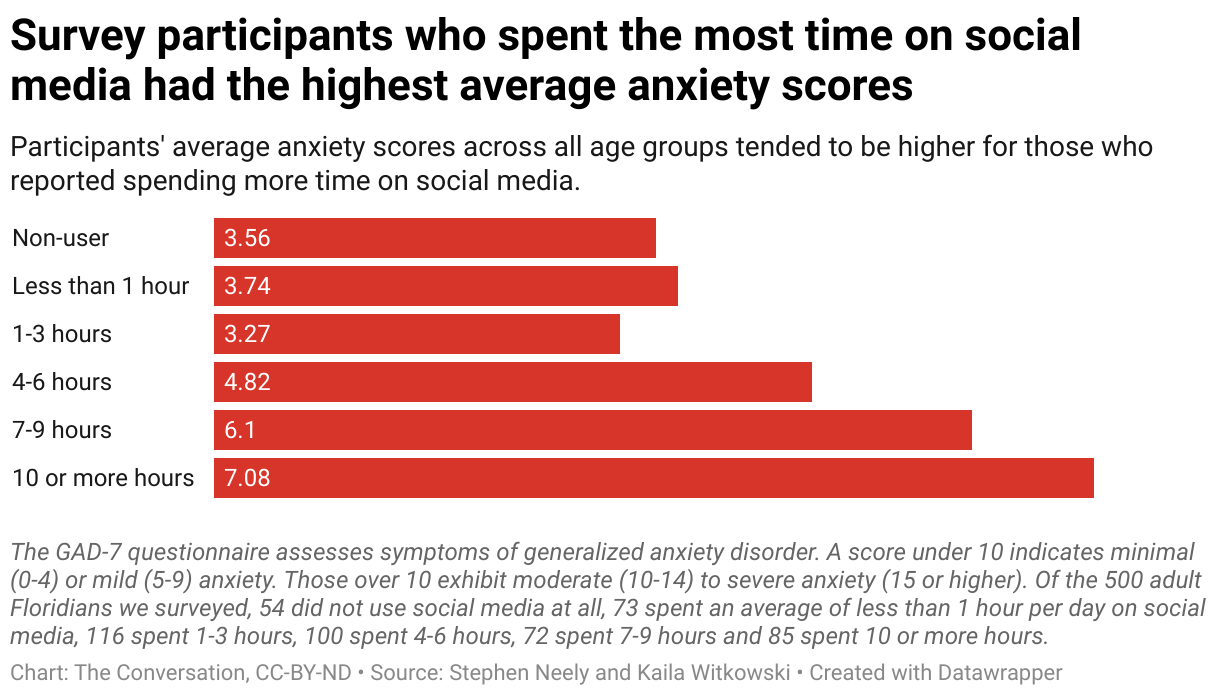 We cannot be sure from just this survey that social media alone is to blame for increased generalized anxiety. Other factors may be involved, such as digital information overload and a decline in person-to-person contact. But the amount of time spent on social media does appear to be affecting the mental health of young people in Florida.