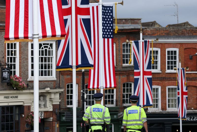 Police officers patrol as ceremonial U.S. and Union Jack flags hang during U.S. President Donald Trump and first lady Melania Trump's state visit, in Windsor, Britain, September 18, 2025. REUTERS/Toby Melville
