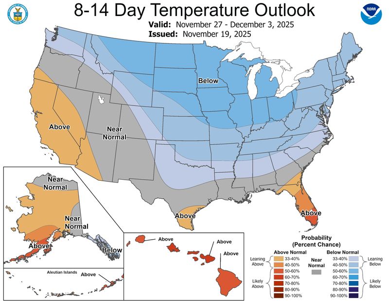 "Following a warm start to November in the West and a cold start in the East, a significant pattern change is likely later in the month and into early December," the Climate Prediction Center wrote. "During Thanksgiving week, a colder pattern is likely for the West and the Northern Plains while milder air overspreads the East."