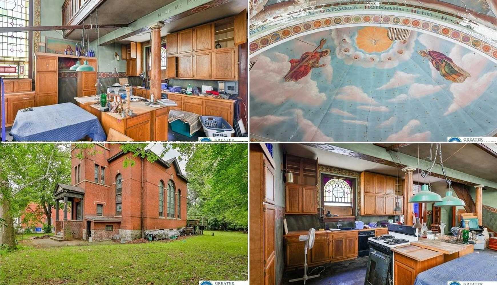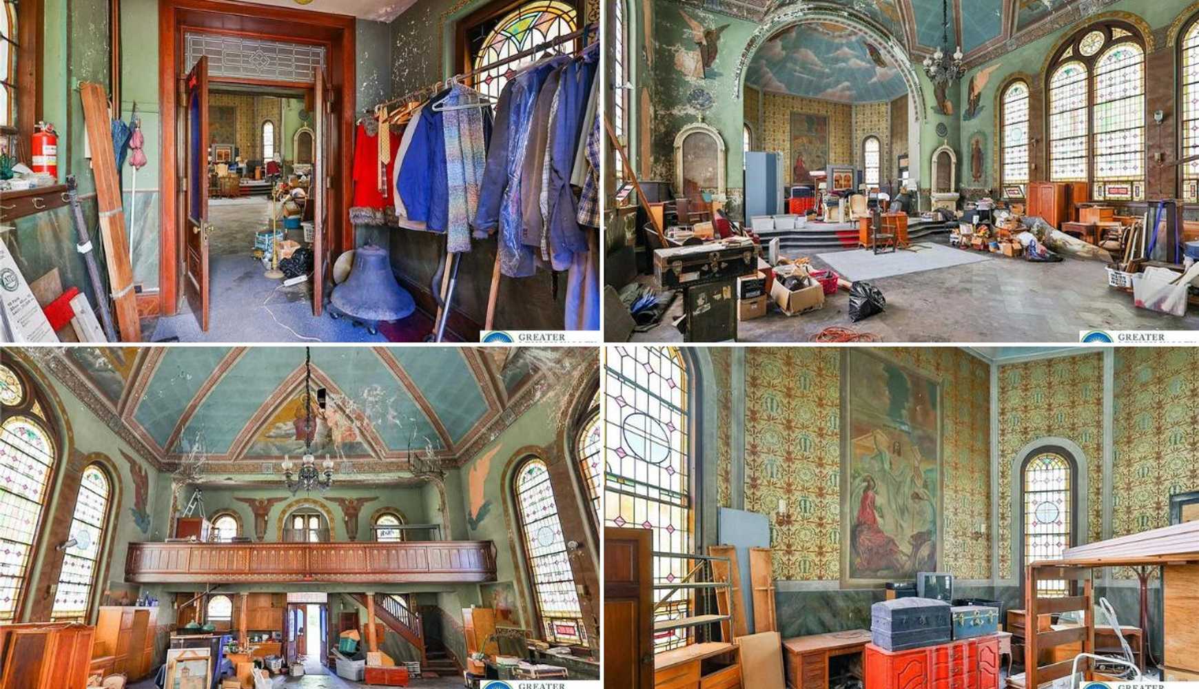 Photos show a building that needs significant cosmetic work. The main room includes ornate wallpaper depicting Jesus, angels, and clouds—now peeling in sections—and several interior surfaces show signs of age and disrepair.
