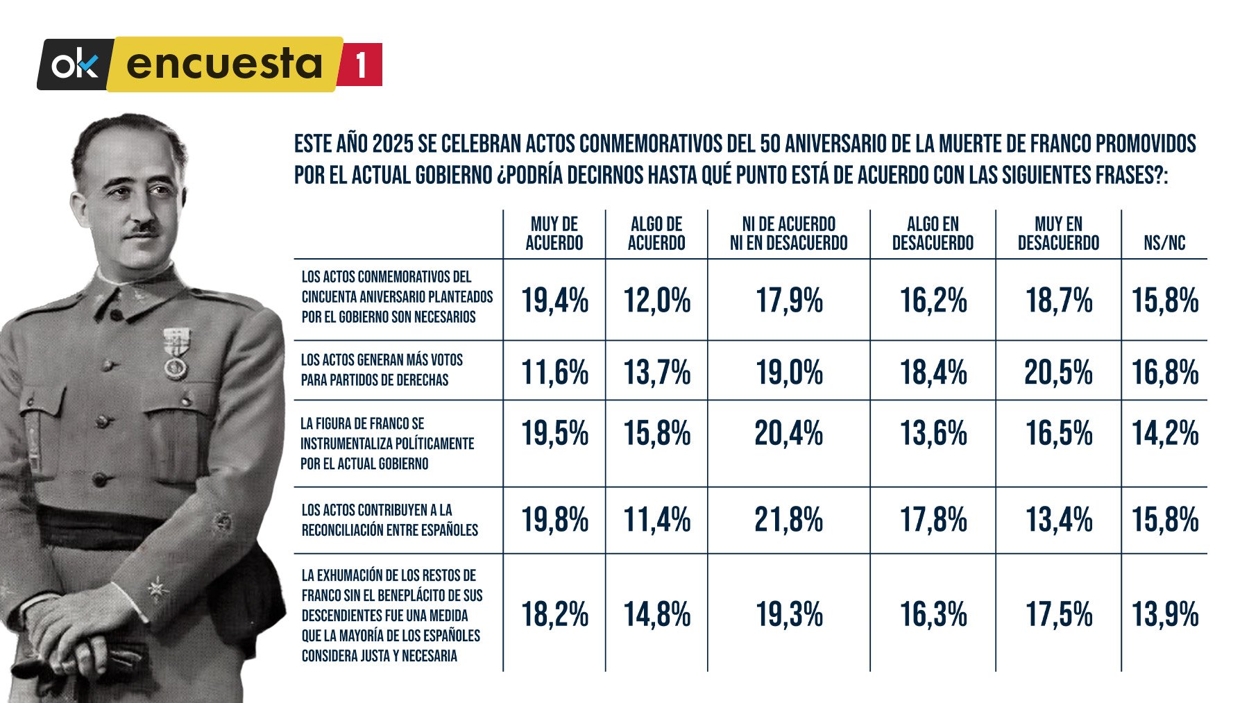 La encuesta general apunta a una conclusión clara: la memoria histórica sigue siendo un terreno extremadamente sensible y profundamente fragmentado, donde ningún relato logra imponerse de forma dominante. Pero, sobre todo, revela que el intento del Gobierno por reactivar el debate sobre Franco de cara al 50 aniversario no conecta con la mayoría social.