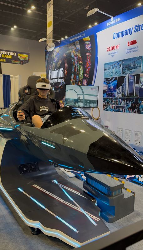 Multiple expo booths showcased virtual reality experiences. The ones that stood out paired VR with physical effects in motion simulators, like the VR Fighter Aircraft by FuninVR.