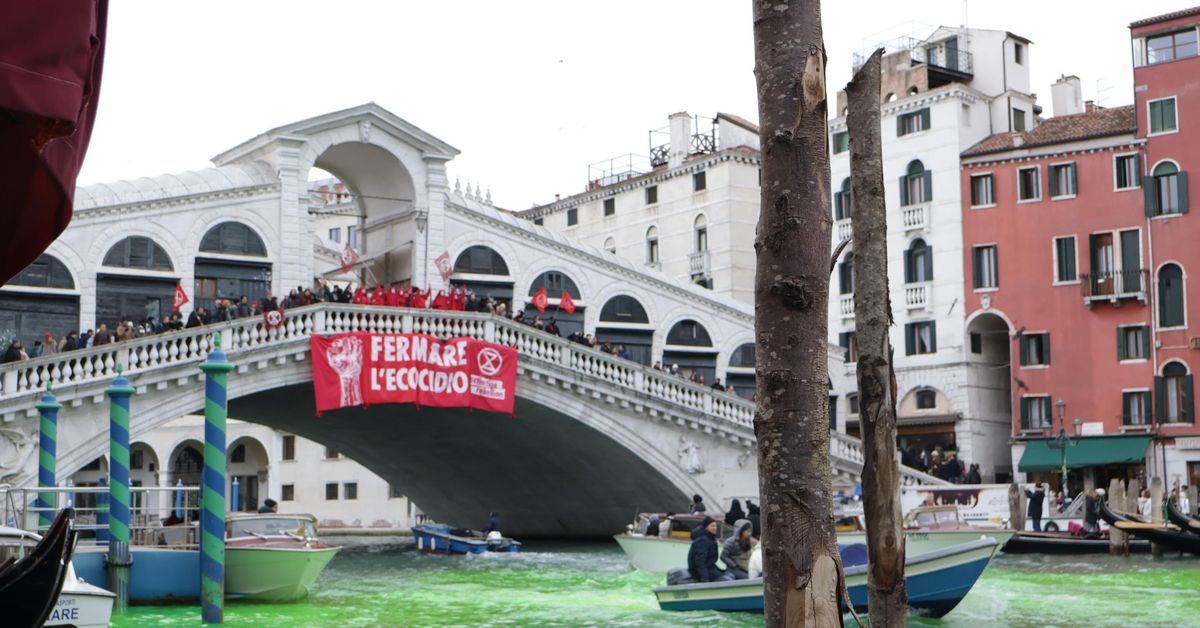 La protesta de este sábado llega casi dos años después de una acción similar, en 2023, cuando Extinction Rebellion también tiñó de verde el Gran Canal de Venecia para denunciar la inacción durante la COP28, bajo el lema “Mientras el gobierno habla, nosotros pendemos de un hilo”.
