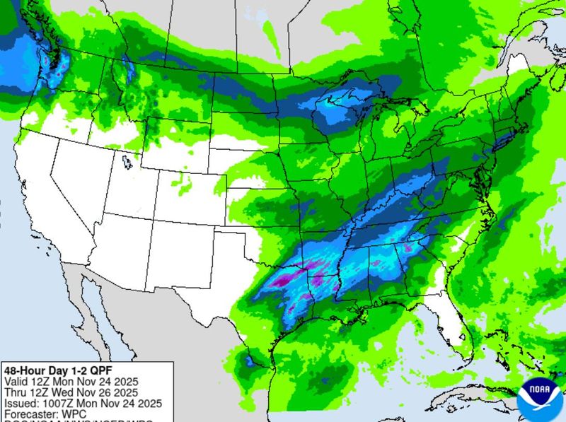 Over the coming days, the storm is expected to move north, bringing downpours to the lower Great Lakes, Ohio Valley, Mid-Atlantic region and parts of New England through Wednesday, Nov. 26.